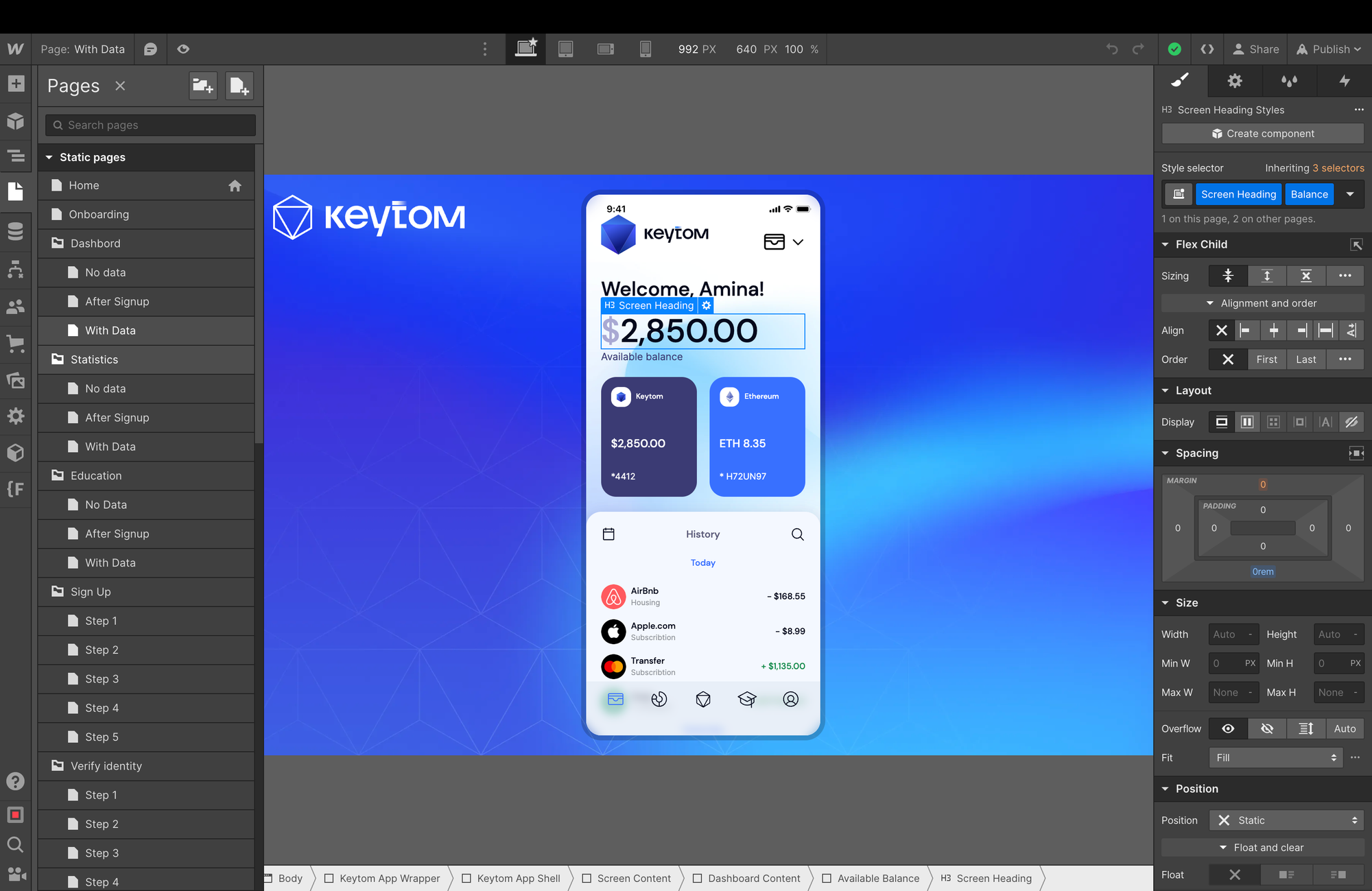 - На каждый экран или шаг в прототипе сделана отдельная страница. Сначало хотел делать с помощью анимации и разделить прототип на крупные блоки и делать все мелкие стейты внутри одной страницы, например, менять слайды или с помощью анимации, но попробывал и очень запарился с этими анимациями.